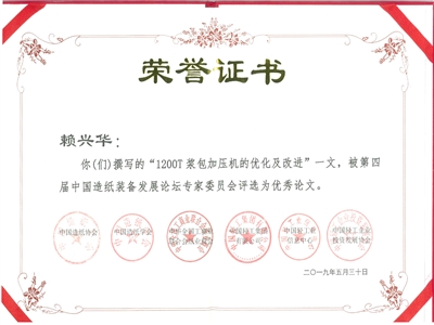 在論壇優(yōu)秀論文頒獎(jiǎng)典禮上,長(zhǎng)泰公司賴興華撰寫的《1200T漿包加壓機(jī)的優(yōu)化及改進(jìn)》被評(píng)選為優(yōu)秀論文。