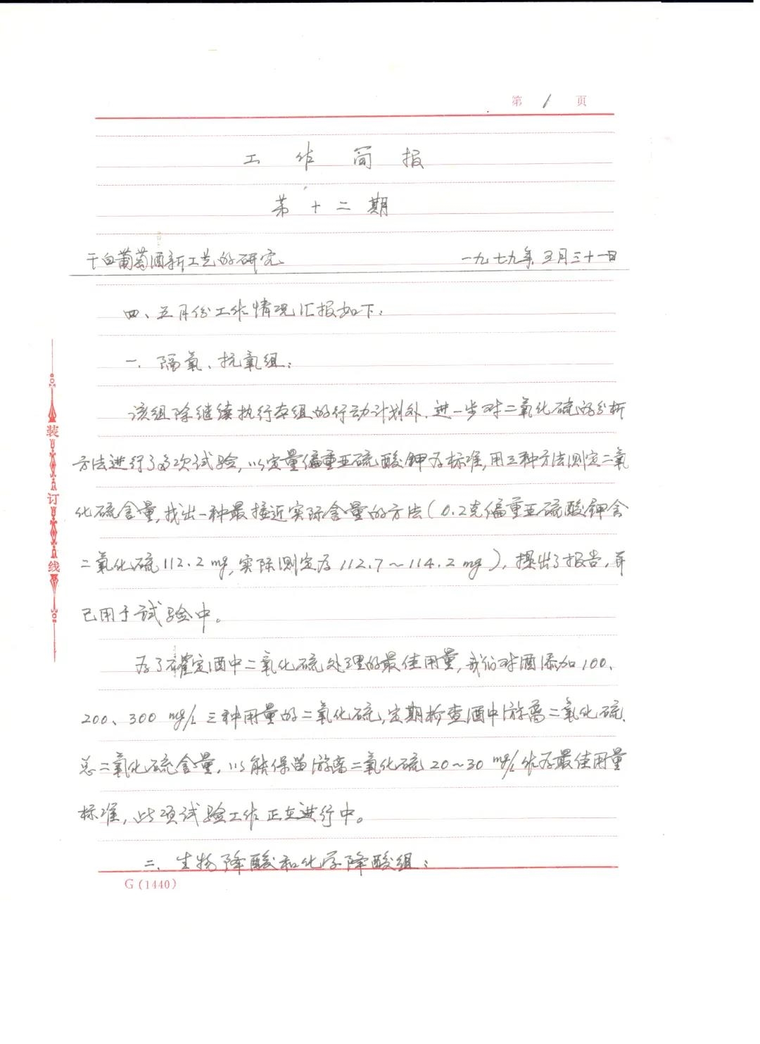歷史留痕于檔案之上,歲月凝固于檔案之中。在保利中輕中國(guó)食品發(fā)酵工業(yè)研究院的檔案管理室,收藏著眾多泛黃的檔案。其中,26期由中國(guó)葡萄酒泰斗——郭其昌教授親筆記錄的簡(jiǎn)報(bào)尤為珍貴。翻開這一頁(yè)頁(yè)泛黃的紙張,我們循著歷史的痕跡,揭開了新中國(guó)第一瓶干白的誕生記憶。