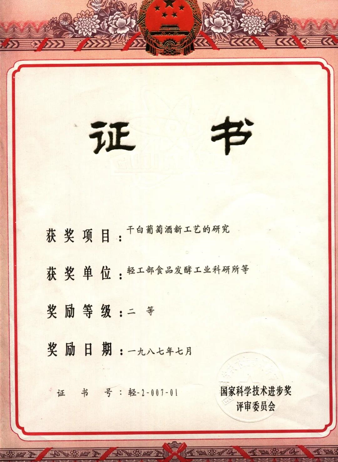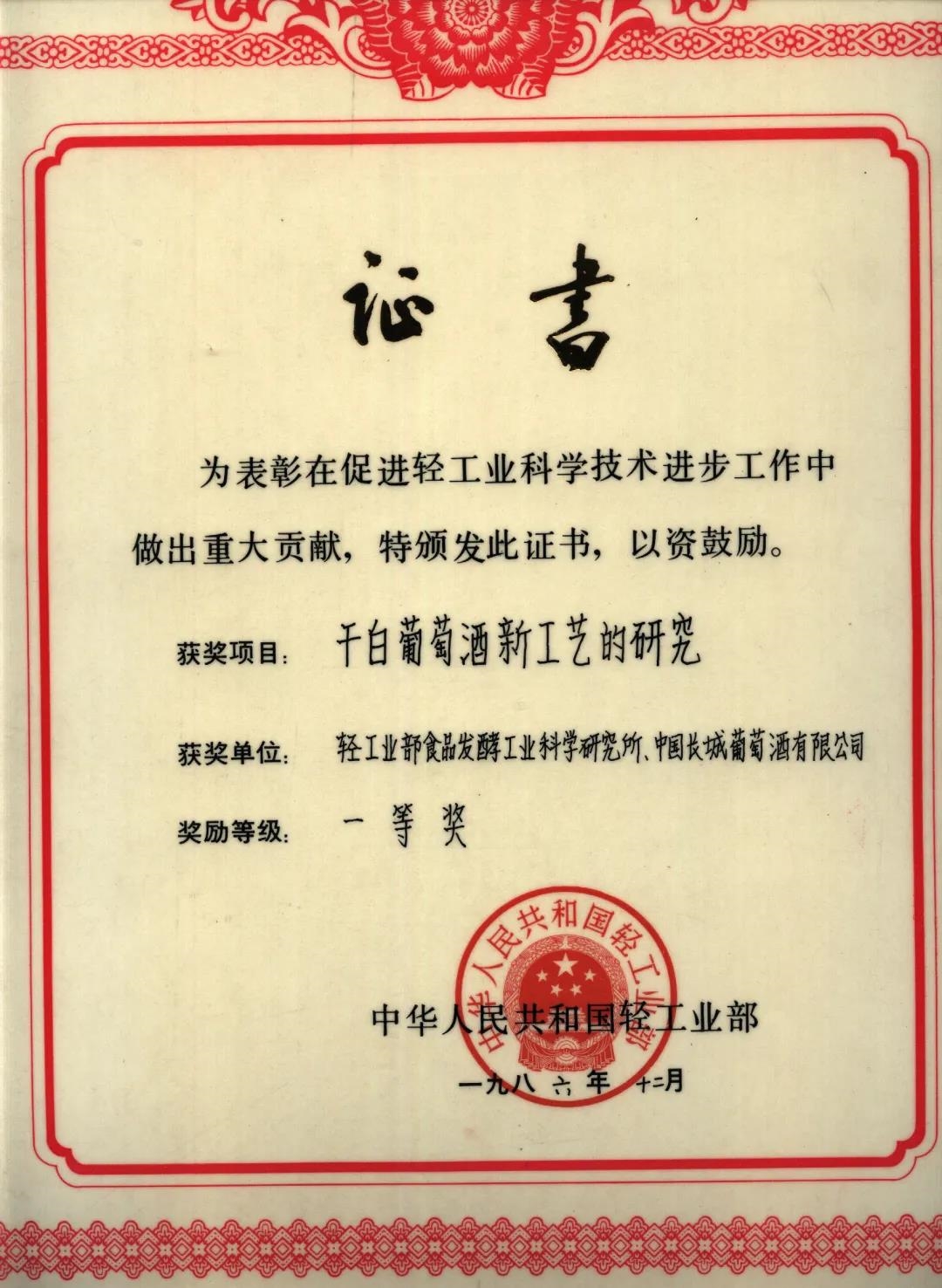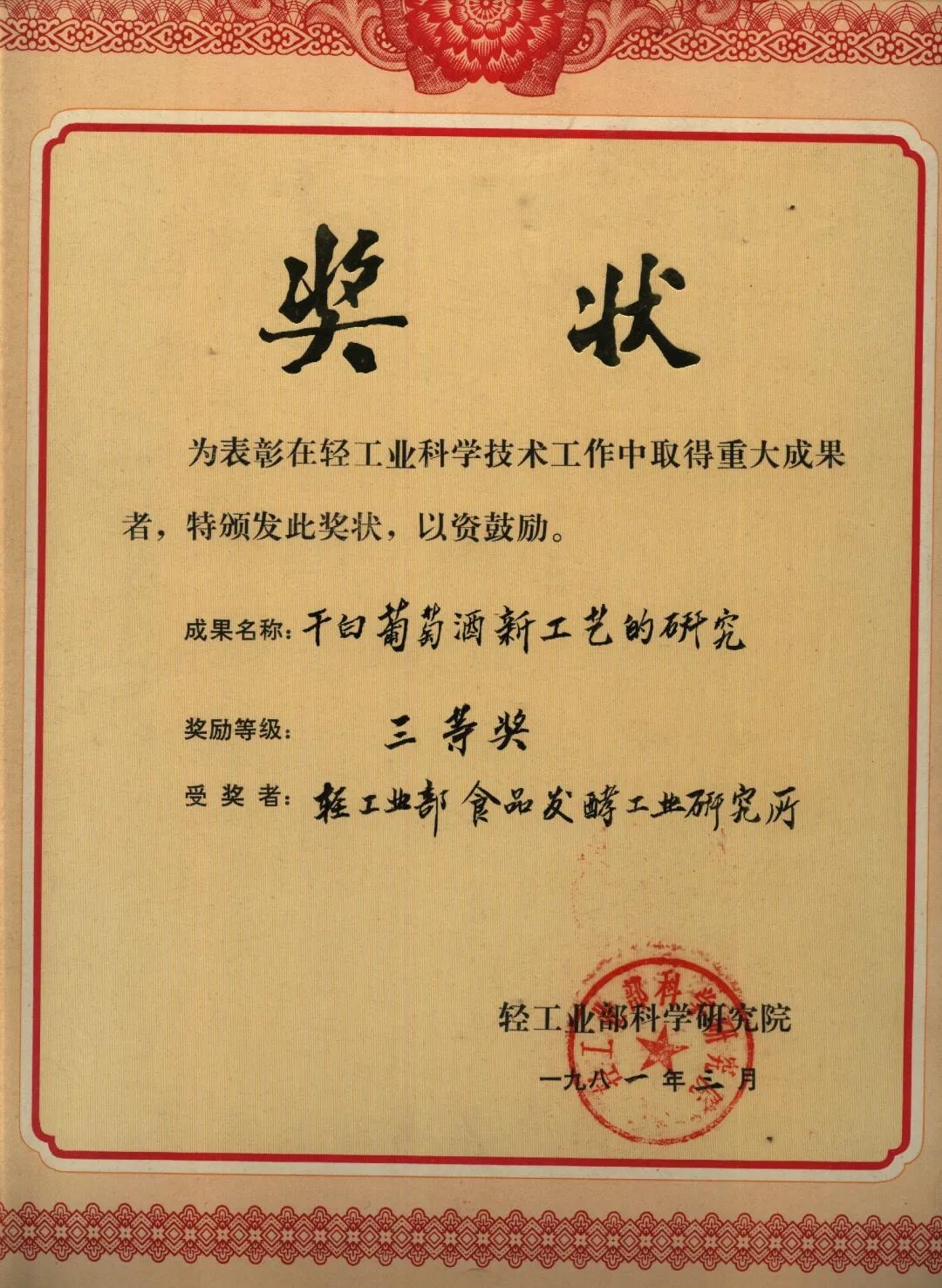 1979年,該葡萄酒獲得國(guó)家第三屆評(píng)酒會(huì)金獎(jiǎng)和國(guó)家質(zhì)量金獎(jiǎng);1983年在英國(guó)倫敦國(guó)際第14屆評(píng)酒會(huì)獲國(guó)際銀獎(jiǎng),這是70余年來(lái)我國(guó)酒類在國(guó)際上首次獲獎(jiǎng)。該項(xiàng)目198312月通過(guò)原輕工部科技局組織的技術(shù)鑒定,成果達(dá)到國(guó)際先進(jìn)水平,1987年榮獲國(guó)家科技進(jìn)步二等獎(jiǎng)。中國(guó)第一瓶干白的研制成功,不僅為國(guó)家培養(yǎng)了大批的專業(yè)技術(shù)人才,也為我國(guó)葡萄酒工業(yè)的發(fā)展壯大奠定了良好的基礎(chǔ)。