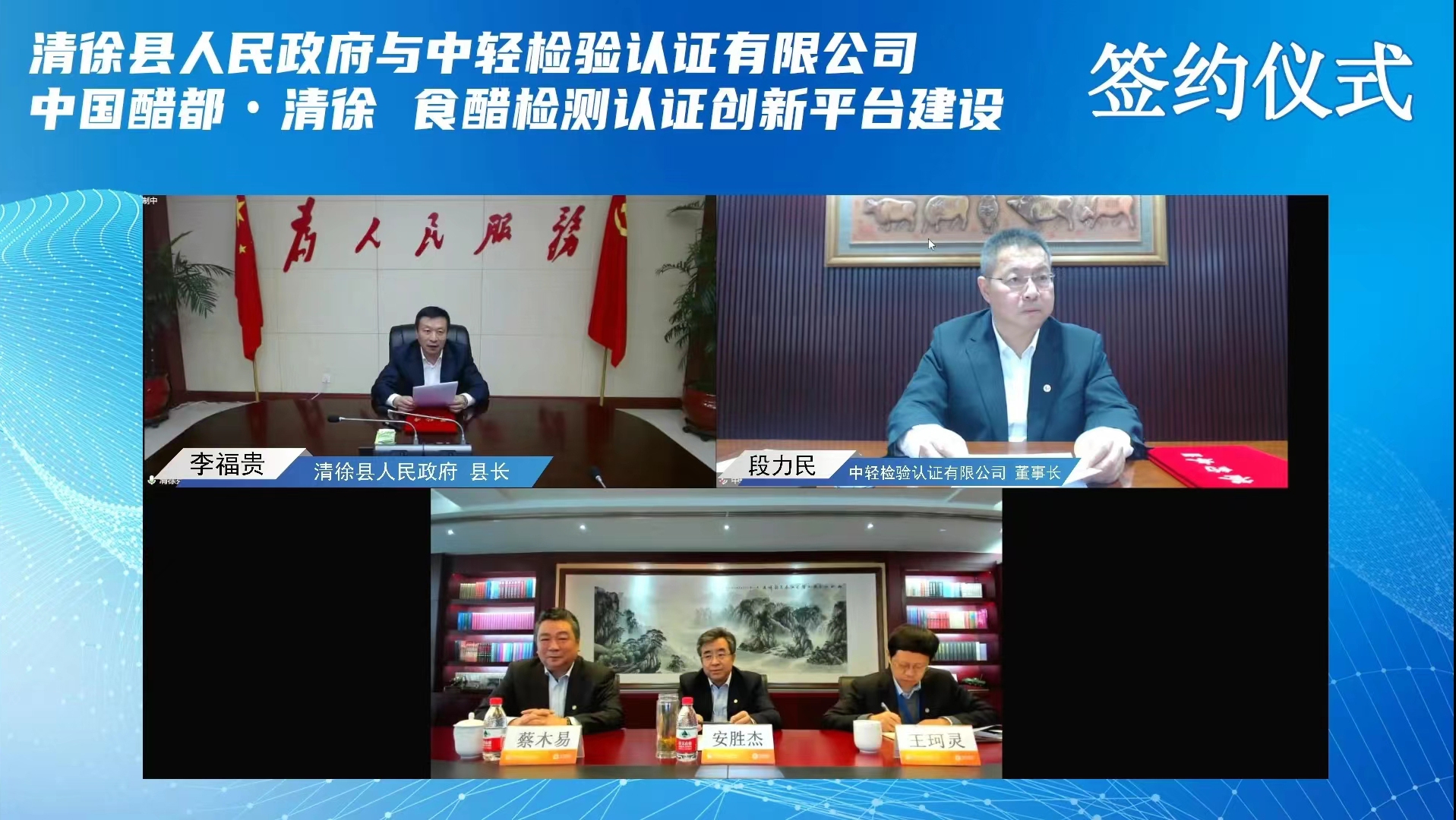 為進(jìn)一步落實(shí)習(xí)近平總書記在黨的二十大報(bào)告中提出的“必須堅(jiān)持科技是第一生產(chǎn)力、人才是第一資源、創(chuàng)新是第一動(dòng)力,深入實(shí)施科教興國(guó)戰(zhàn)略、人才強(qiáng)國(guó)戰(zhàn)略、創(chuàng)新驅(qū)動(dòng)發(fā)展戰(zhàn)略,開辟發(fā)展新領(lǐng)域新賽道,不斷塑造發(fā)展新動(dòng)能新優(yōu)勢(shì)。” 11月11日,保利中輕所屬中輕檢驗(yàn)與山西省太原市清徐縣人民政府以線上“云簽約”形式舉行食醋檢測(cè)認(rèn)證創(chuàng)新平臺(tái)合作項(xiàng)目簽約儀式。保利集團(tuán)總經(jīng)理助理,保利中輕黨委書記、董事長(zhǎng)安勝杰;保利中輕黨委副書記、總經(jīng)理王珂靈,副總經(jīng)理蔡木易出席簽約儀式。