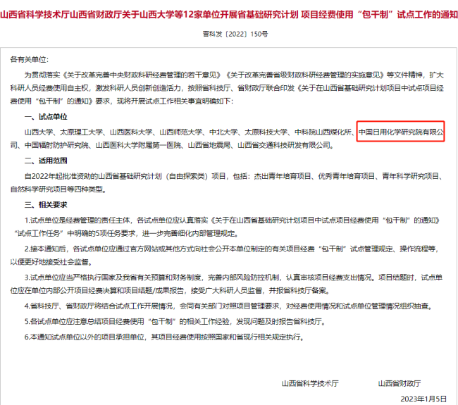 中國日用化學(xué)研究院獲批成為山西省基礎(chǔ)研究計劃項目經(jīng)費(fèi)使用“包干制”試點(diǎn)單位 。中國日用化學(xué)研究院將以此為契機(jī),加大科研投入,激發(fā)科研人員創(chuàng)造活力,不斷提升創(chuàng)新能力。