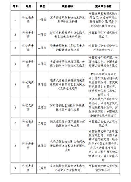 保利中輕獲得2022年中國輕工業(yè)聯(lián)合會科技獎明細
