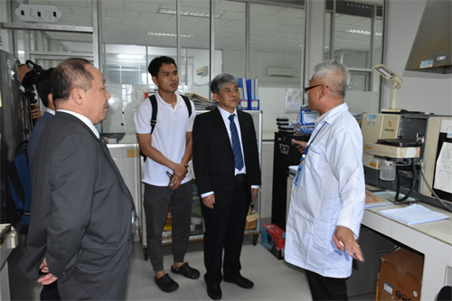 曹春昱一行首先來(lái)到柬埔寨國(guó)家科學(xué)技術(shù)創(chuàng)新實(shí)驗(yàn)室(STINL),參觀水化學(xué)檢測(cè)室、重金屬元素分析室、果汁及啤酒中試車間等實(shí)驗(yàn)室場(chǎng)所,詳細(xì)了解“一帶一路”聯(lián)合實(shí)驗(yàn)室運(yùn)行情況及此前中方援助設(shè)備使用情況。