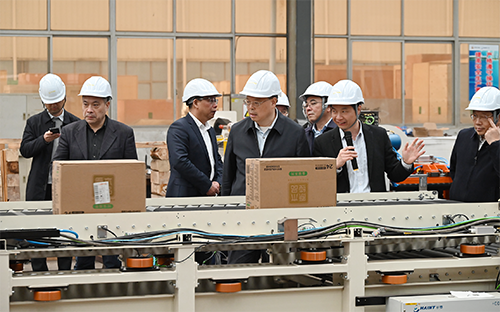 張劍飛一行深入生產(chǎn)車間,實(shí)地考察企業(yè)生產(chǎn)經(jīng)營情況。屈輝現(xiàn)詳細(xì)匯報企業(yè)發(fā)展歷程、主營業(yè)務(wù)、創(chuàng)新研發(fā)成果、核心競爭力及未來發(fā)展規(guī)劃,并現(xiàn)場演示紙箱件智能裝車系統(tǒng)測試運(yùn)行。
