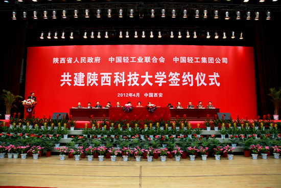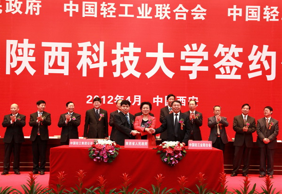 2012417日,陜西省人民政府與中國(guó)輕工業(yè)聯(lián)合會(huì)、中國(guó)輕工集團(tuán)公司共建陜西科技大學(xué)簽約儀式在陜西科技大學(xué)隆重舉行。集團(tuán)公司董事長(zhǎng)、黨委書(shū)記陳鄂生出席簽約儀式,并代表集團(tuán)公司與陜西省朱靜芝副省長(zhǎng)、中國(guó)輕工業(yè)聯(lián)合會(huì)步正發(fā)會(huì)長(zhǎng)簽署共建協(xié)議。
