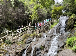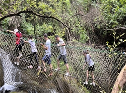 上午,大家一起沿著峽谷逆流而上,邊玩水邊漫步,兩側(cè)峰巒競秀,巖石嶙峋,溪水清涼,奔流而下,發(fā)出響亮的淙淙聲……置身清涼的森林溪水間,惱人的暑氣即刻就被趕走了。走在凌空于絕壁的玻璃橋上,有一種踏云而行的快感,與孩子一起感受玻璃滑道,享受快樂的親子時光。